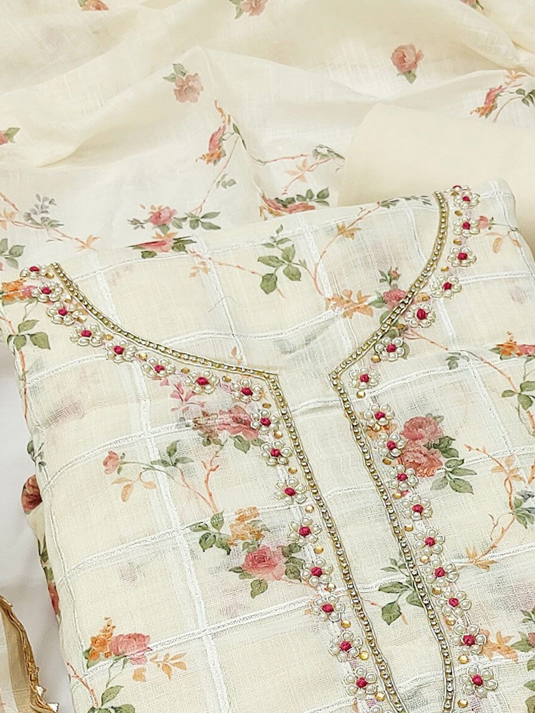 Peachmode presents this elegant Cream Dress Material crafted for Women. Made using premium Not Available, this outfit features a refined Not Available silhouette, a stylish Not Available neckline and Not Available. The Not Available hemline and Not Available length complete the look. Perfect for Festive wear.
